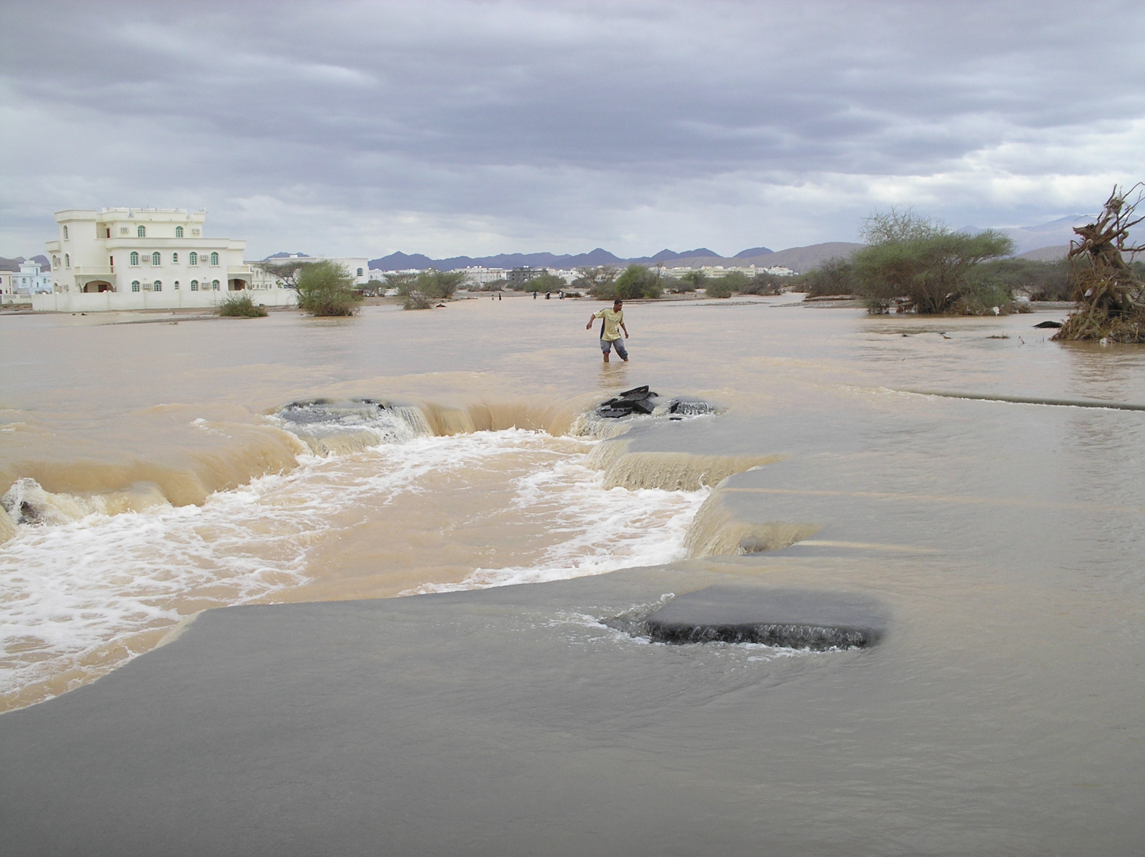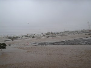 Torrential rain woke me at four. Now the internet said Gonu had changed course again, and was coming directly at Muscat. Sur was being badly battered. When red light dawned we let the children run about outside in the rain, before it got worse and we’d have to keep them in the house. The storm intensified throughout the day. Before noon the wadi must have overbrimmed because the floods came. It always floods when it rains here, the earth being baked and unabsorbent, the city on an edge between rock mountains and the sea, but this time the floods stretched as far as we could see. Water poured through the windows in two rooms, soaking carpets and furniture, making us work with mop and mesaaha. Water started dripping though the ceiling, and here I went up to our Lebanese neighbour whose balcony was flooded. He couldn’t open the door to it so we unscrewed a window frame and got out that way to break the blocked drain pipe with a hammer and bail out with buckets. From up there I saw the building was an island, and many of our neighbours were submerged to the second storey.