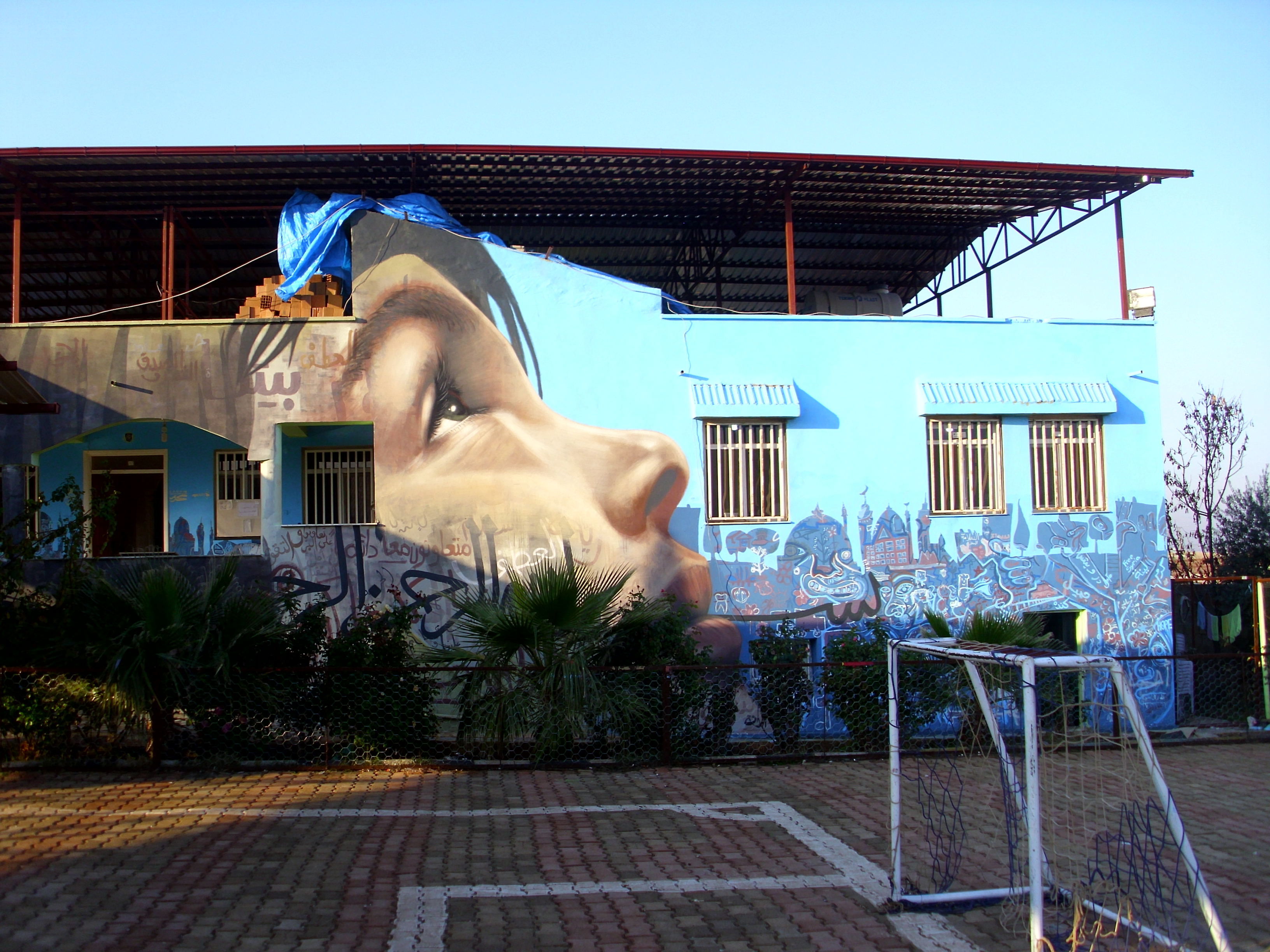 Max Frieder’s Artolution organised large-scale canvas painting (I saw it done but still couldn’t understand how the hands of hundreds of babbling children created pictures that made coherent sense) while the AptART team involved the children in designing and painting a mural for the school wall. The result was impressive, something every child will remember in future years – an uplifted face on a background of calligraphed phrases (In the name of God the Compassionate the Merciful, Cooperating for a Better Future, Love, Hope, Dignity…), upraised hands, grinning faces, and the towers and minarets of a cityscape.