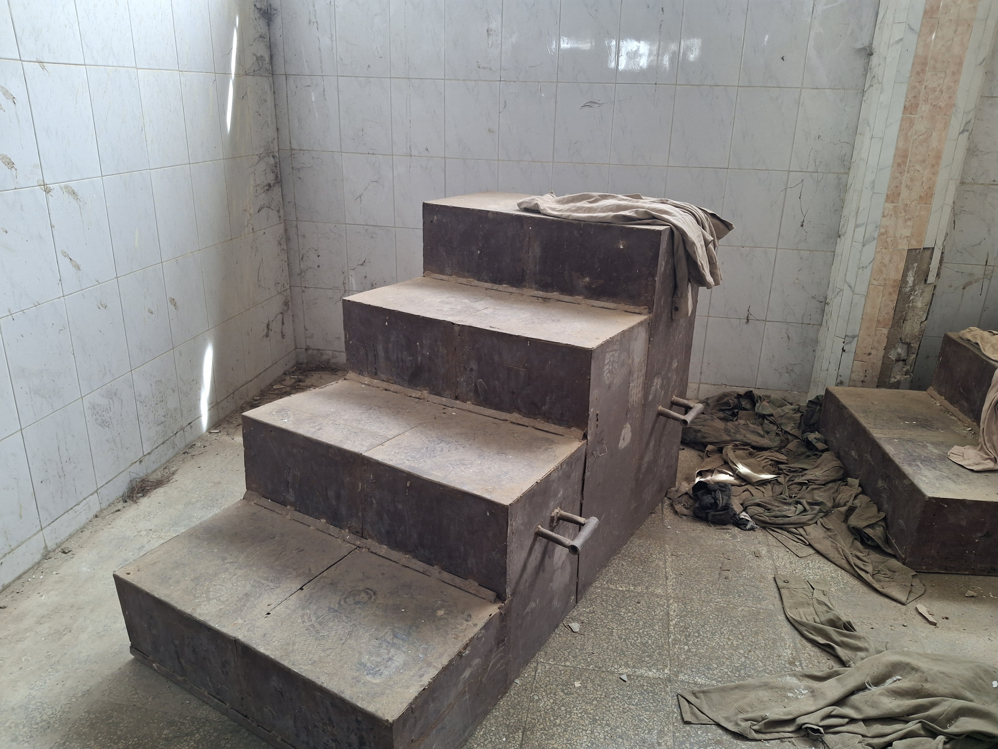 The whirlwind of revolutionary change has hit the place. Rubble and rubbish litter the entrance. I and the photographers climb a few steps into the reception room where prisoners were previously pushed into narrow caged corridors and stripped of their clothes. It isn’t hard to imagine the screams and thuds as new arrivals received their ‘reception party’ beatings. Although on second thoughts, my imagination may be overdoing it. Absolute silence was often enforced on the victims, even during torture.