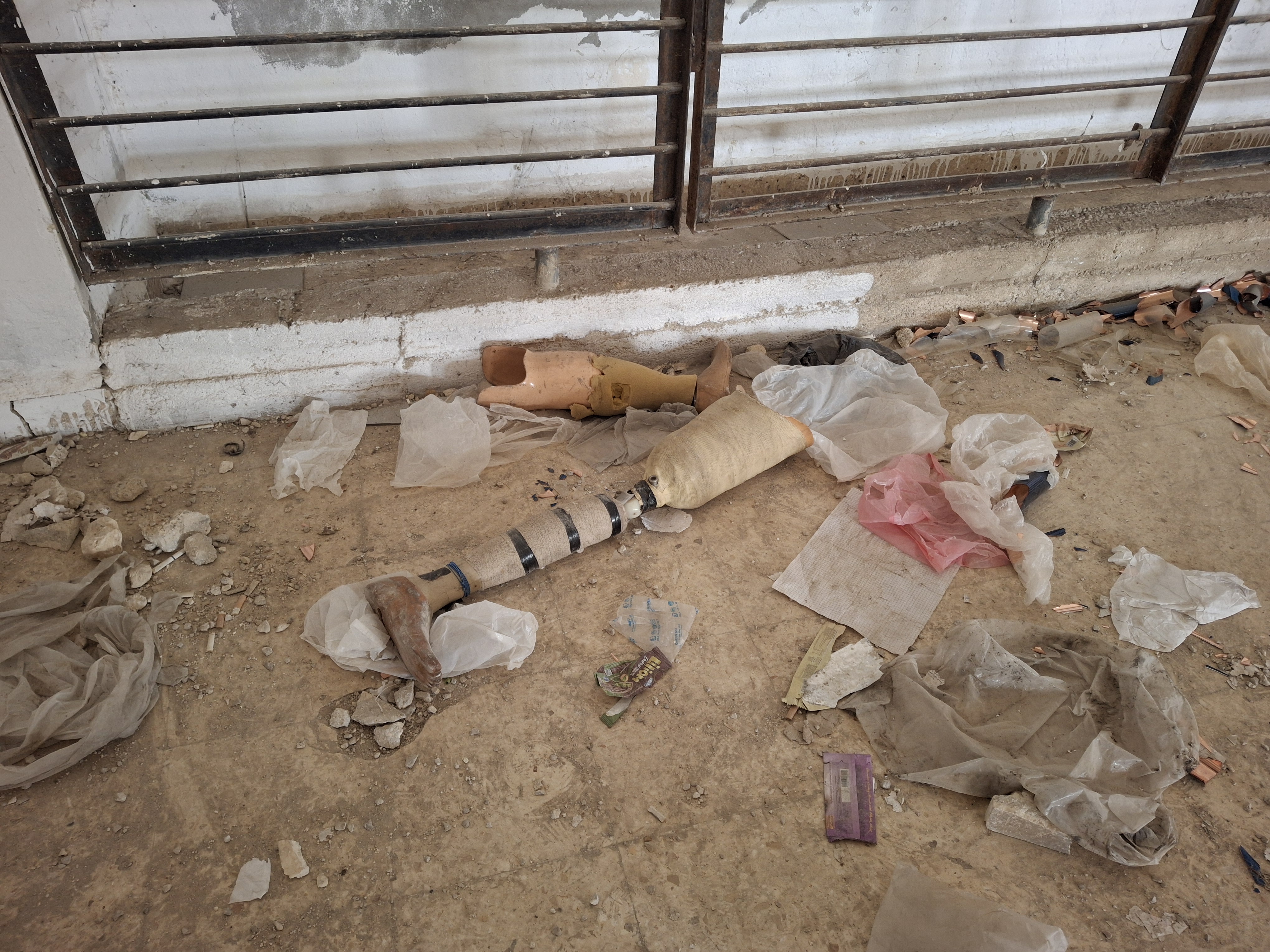 Amongst the detritus here on the filthy tiled floor, a couple of artificial legs lie marooned. They are made of very basic plastic, one to fit beneath a knee, one to replace an entire limb from the hip down. I can’t understand why they’re still here. Surely their owners didn’t discard them when they fled? Later, however, I read the transcript of an interview with a survivor of the prison. He described the reception room process: “If you have a prosthetic leg, they throw it away. If you have glasses, they get rid of them.”