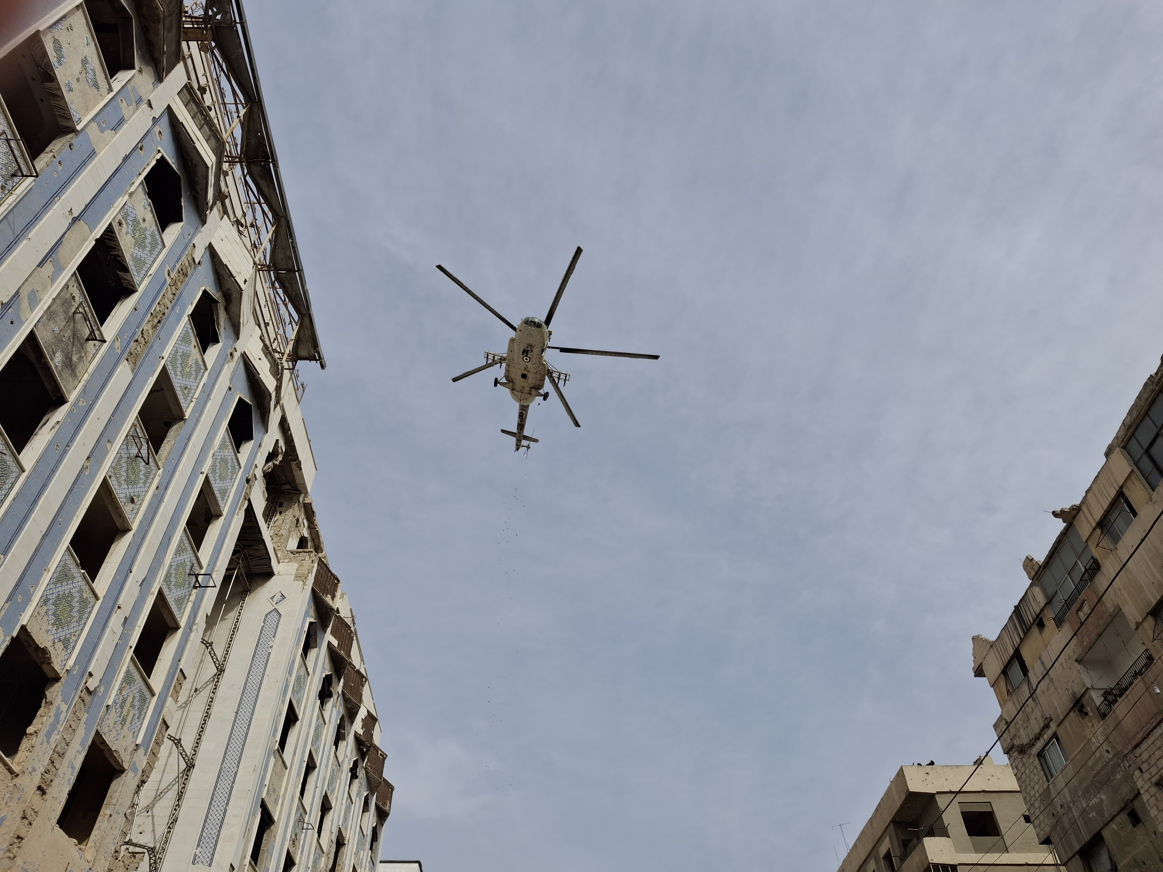 So was a little girl called Sidra, who approached to say hello. I asked if she lived in Douma. In her very tiny voice, she said she did. I asked who she’d come to the demonstration with. I don’t have anyone, she said. The impact of those words only hit me a few minutes later. Sidra looked a lot younger than the thirteen years old she claimed, but malnutrition will do that to a child. This area suffered starvation siege as well as years of continuous bombardment. At the demonstration, in a reconfigured memory of those assaults, a military helicopter passed overhead. This time, instead of dropping gas canisters or explosive barrels, it threw down roses. Here was another awkward symbol – even as boys rushed to grab the flowers, the more traumatized in the crowd flinched.