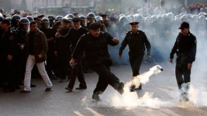 When January 25th’s Day of Anger started, police at first allowed protesters to move freely in the streets. This was unusual, and suggests fear on the authorities’ part, as does the abrupt shift back to traditional methods as night fell. At the time of writing, at least a thousand people have been arrested, several killed, and hundreds beaten. (Here’s an audio recording of Guardian journalist Jack Shenker’s experience being trucked into the desert with other protesters.) Uniformed police are backed up by plainclothes goons, many armed with iron bars. (One hopes that someone is collecting photographs of these people in order to identify and shame them.)